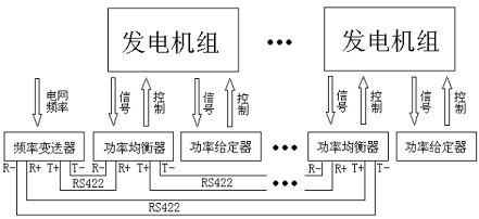 頻率變送器測量到電網頻率不在其設置的頻率上下限范圍內,如頻率低于下限,則向所有功率均衡器發(fā)送增速控制命令,功率均衡器按頻率變送器設置的繼電器吸合、釋放時間對本儀表的增速繼電器進行動作,調節(jié)電網頻率。如果高于上限,則發(fā)送減速控制命令。